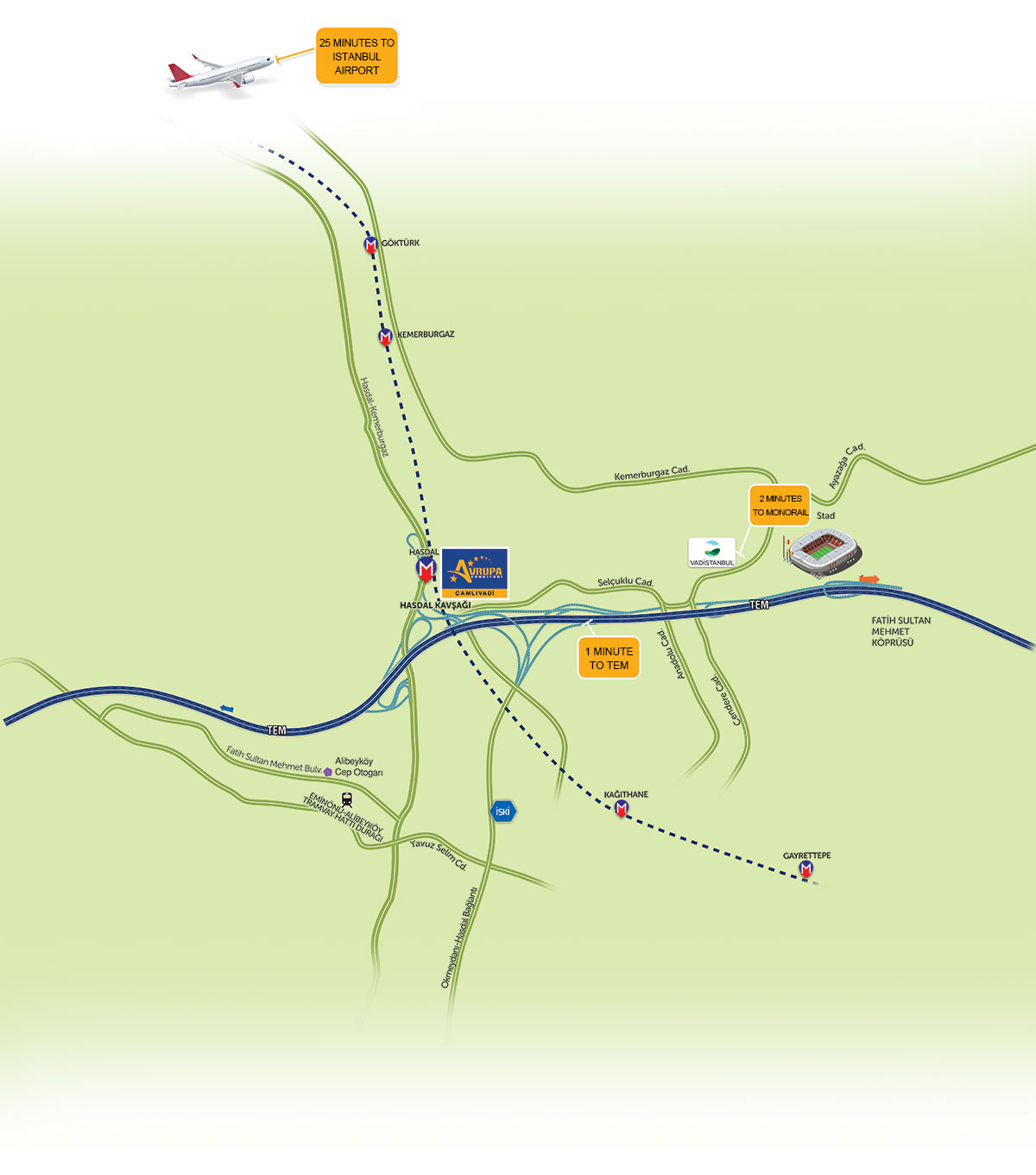 1 minute by private car, Maslak 3 minutes, FSM Bridge 5 minutes. Havaray, which connects to the entire metro network, is only 2 minutes.